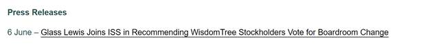 Glass Lewis: “…we tend to agree with one of the Dissident’s central points that long-term underperformance is due, in part, to WisdomTree’s inability to consistently achieve operating leverage by translating AUM growth and inflows into greater revenue growth and profitability. In our view, this aspect of the Company’s performance track record is particularly difficult to overlook when long-tenured directors and executives remain in key leadership and oversight roles.”