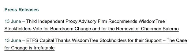 Third Independent Proxy Advisory Firm Recommends WisdomTree Stockholders Vote for Boardroom Change and for the Removal of Chairman Salerno