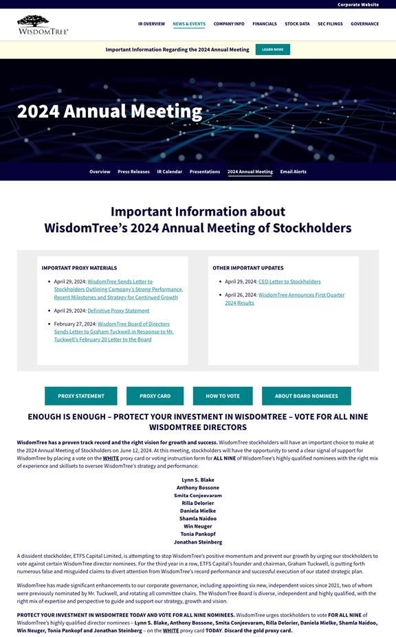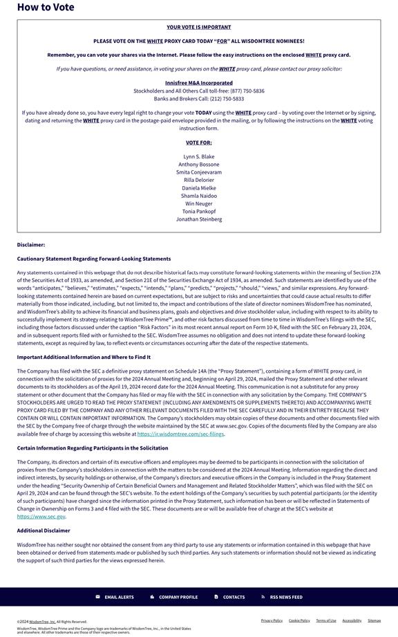 Corporate Website IR OVERVIEW NEWS & EVENTS COMPANY INFO FINANCIALS STOCK DATA SEC FILINGS GOVERNANCE WtSDOMT REE• A Message from Wisdom Tree's CEO 2024 Annual Me.eting • • • • Overview Press Releases ... •• • • IR Calendar • •• • • • • • • • Presentations • • • • • • • • • • •• • Email Alerts Important Information about WisdomTree's 2024 Annual Meeting of Stockholders IMPORTANT PROXY MATERIALS OTHER IMPORTANT UPDATES • April 29, 2024: Wisdom Tree Sends Letter to Stockholders Outlining Company's Strong Performance, Recent Milestones and Strategy for Continued Growth • April 29, 2024: Definitive Proxy Statement • February 27, 2024: Wisdom Tree Board of Directors Sends Letter to Graham Tuckwell in ResP-onse to Mr. Tuckwell's FebruarY- 20 Letter to the Board PROXY STATEMENT PROXY CARD • April 29, 2024: CEO Letter to Stockholders • April 26, 2024: Wisdom Tree Announces First Quarter 2024 Results HOW TO VOTE ABOUT BOARD NOMINEES ENOUGH IS ENOUGH - PROTECT YOUR INVESTMENT IN WISDOMTREE -VOTE FOR ALL NINE WISDOMTREE DIRECTORS WisdomTree has a proven track record and the right vision for growth and success. Wisdom Tree stockholders will have an important choice to make at the 2024 Annual Meeting of Stockholders on June 12, 2024. At this meeting, stockholders will have the opportunity to send a clear signal of support for Wisdom Tree by placing a vote on the WHITE proxy card or voting instruction form for ALL NINE of Wisdom Tree's highly qualified nominees with the right mix of experience and skillsets to oversee Wisdom Tree's strategy and performance: Lynn S. Blake Anthony Bossone Smita Conjeevaram Rilla Delorier Daniela Mielke Shamla Naidoo Win Neuger Tonia Pankopf Jonathan Steinberg A dissident stockholder, ETFS Capital Limited, is attempting to stop Wisdom Tree's positive momentum and prevent our growth by urging our stockholders to vote against certain Wisdom Tree's director nominees. For the third year in a row, ETFS Capital's founder and chairman, Graham Tuckwell, is putting forth numerous fa lse and misguided claims to divert attention from Wisdom Tree's record performance and successful execution of our stated strategic plan. Wisdom Tree has made significant improvements to our corporate governance, including appointing six new, independent voices, two of which were previously nominated by Mr. Tuckwell, and rotating all committee chairs. The Wisdom Tree Board is diverse, independent and highly qualified, with the right mix of expertise and perspective to guide and support our strategy, growth and vision. PROTECT YOUR INVESTMENT IN WISDOMTREE TODAY AND VOTE FOR ALL NINE NOMINEES. Wisdom Tree urges stockholders to vote FOR ALL NINE of Wisdom Tree's highly qualified director nominees - Lynn S. Blake, Anthony Bossone, Smita Conjeevaram, Rilla Delorier, Daniela Mielke, Shamla Naidoo, Win Neuger, Tonia Pankopf and Jonathan Steinberg - on the WHITE proxy card TODAY. Discard the gold proxy card. How to Vote YOUR VOTE IS IMPORTANT PLEASE VOTE ON THE WHITE PROXY CARD TODAY "FOR" ALL WISDOMTREE NOMINEES! Remember, you can vote your shares via the Internet. Please follow the easy instructions on the enclosed WHITE proxy card. If you have questions, or need assistance, in voting your shares on the WHITE proxy card, please contact our proxy solicitor: lnnisfree M&A lncor(!orated Stockholders and All Others Call toll-free: (877) 750-5836 Banks and Brokers Call: (212) 750-5833 If you have already done so, you have every legal right to change your vote TODAY using the WHITE proxy card - by voting over the Internet or by signing, dating and returning the WHITE proxy card in the postage-paid envelope provided in the mailing, or by following the instructions on the WHITE voting instruction form. Disclaimer: Cautionary Statement Regarding Forward-Looking Statements VOTE FOR: Lynn S. Blake Anthony Bessone Smita Conjeevaram Rilla Delorier Daniela Mielke Shamla Naidoo Win Neuger Tonia Pankopf Jonathan Steinberg Any statements contained in this webpage that do not describe historical facts may constitute forward-looking statements within the meaning of Section 27A of the Securities Act of 1933, as amended, and Section 21E of the Securities Exchange Act of 1934, as amended. Such statements are identified by use of the words "anticipates," "believes' " "estimates," "expects'" " intends'" "pla'ns" " predicts'" "proJ·ects'" "should'" "vi,ews " and similar expressions • Any forwardlooking statements contained herein are based on current expectations, but are subject to risks and uncertainties that could cause actual results to differ materially from those indicated, including, but not limited to, the impact and contributions of the slate of director nominees Wisdom Tree has nominated, and Wisdom Tree's ability to achieve its financial and business plans, goals and objectives and drive stockholder value, including with respect to its ability to successfully implement its strategy relating to Wisdom Tree Prime'", and other risk factors discussed from time to time in Wisdom Tree's filings with the SEC, including those factors discussed under the caption "Risk Factors" in its most recent annual report on Form 10-K, filed with the SEC on February 23, 2024, and in subsequent reports filed with or furnished to the SEC. Wisdom Tree assumes no obligation and does not intend to update these forward-looking statements, except as required by law, to reflect events or circumstances occurring after the date of the respective statements. Important Additional Information and Where to Find It The Company has fi led with the SEC a definitive proxy statement on Schedule 14A (the "Proxy Statement"), containing a form of WHITE proxy card, in connection with the solicitation of proxies for the 2024 Annual Meeting and, beginning on April 29, 2024, mailed the Proxy Statement and other relevant documents to its stockholders as of the April 19, 2024 record date for t