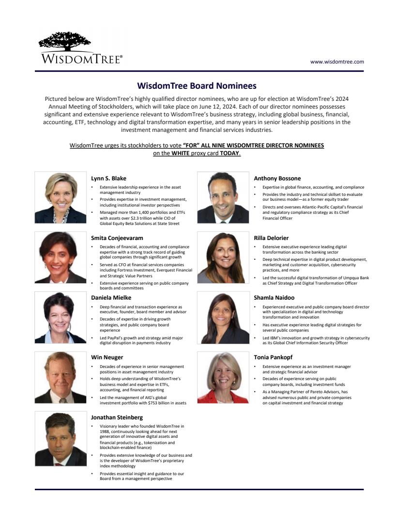 www.wisdomtree.comWisdomTree Board Nominees Pictured below are WisdomTree's highly qualified director nominees, who are up for election at WisdomTree's 2024 Annual Meeting of Stockholders, which will take place on June 12, 2024. Each of our director nominees possesses significant and extensive experience relevant to WisdomTree's business strategy, including global business, financial, accounting, ETF, technology and digital transformation expertise, and many years in senior leadership positions in the investment management and financial services industries.WisdomTree urges its stockholders to vote "FOR" ALL NINE WISDOMTREE DIRECTOR NOMINEES on the WHITE proxy card TODAY.Daniela Mielke?Deep financial and transaction experience as executive, founder, board member and advisor?Decades of expertise in driving growth strategies, and public company board experience?Led PayPal's growth and strategy amid major digital disruption in payments industryLynn S. Blake?Extensive leadership experience in the asset management industry?Provides expertise in investment management, including institutional investor perspectives?Managed more than 1,400 portfolios and ETFs with assets over $2.3 trillion while CIO of Global Equity Beta Solutions at State StreetSmita Conjeevaram?Decades of financial, accounting and compliance expertise with a strong track record of guiding global companies through significant growth?Served as CFO at financial services companies including Fortress Investment, Everquest Financial and Strategic Value Partners?Extensive experience serving on public company boards and committeesWin Neuger?Decades of experience in senior management positions in asset management industry?Holds deep understanding of WisdomTree's business model and expertise in ETFs, accounting, and financial reporting?Led the management of AIG's global investment portfolio with $753 billion in assetsJonathan Steinberg?Visionary leader who founded WisdomTree in 1988, continuously looking ahead for next generation of innovative digital assets and financial products (e.g., tokenization and blockchain-enabled finance)?Provides extensive knowledge of our business and is the developer of WisdomTree's proprietary index methodology?Provides essential insight and guidance to our Board from a management perspectiveShamla Naidoo?Experienced executive and public company board director with specialization in digital and technology transformation and innovation?Has executive experience leading digital strategies for several public companies?Led IBM's innovation and growth strategy in cybersecurity as its Global Chief Information Security OfficerAnthony Bossone?Expertise in global finance, accounting, and compliance?Provides the industry and technical skillset to evaluate our business model?as a former equity trader?Directs and oversees Atlantic-Pacific Capital's financial and regulatory compliance strategy as its Chief Financial OfficerRilla Delorier?Extensive executive experience leading digital transformation across the banking sector?Deep technical expertise in digital product development, marketing and customer acquisition, cybersecurity practices, and more?Led the successful digital transformation of Umpqua Bank as Chief Strategy and Digital Transformation OfficerTonia Pankopf?Extensive experience as an investment manager and strategic financial advisor?Decades of experience serving on public company boards, including investment funds?As a Managing Partner of Pareto Advisors, has advised numerous public and private companies on capital investment and financial strategy